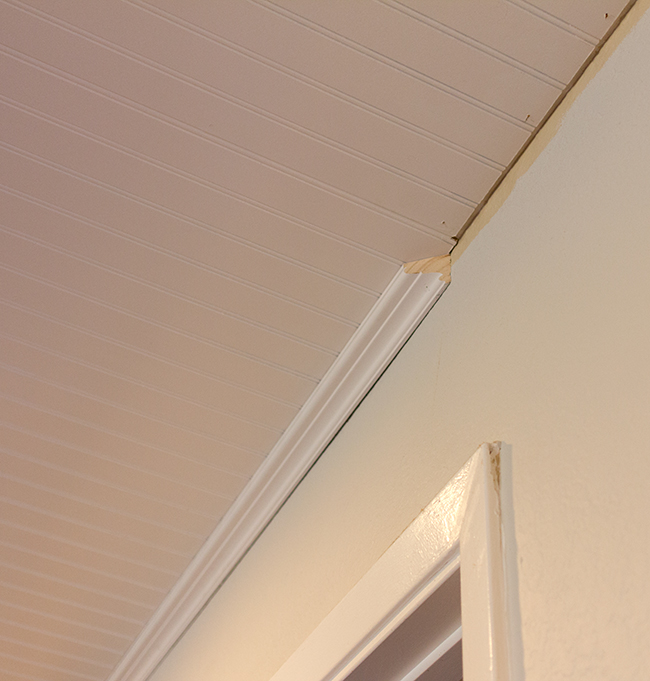 I bought almost $200 worth of crown, baseboard and quarter round to take care of all these unfinished edges that have been driving me crazy for weeks. We bought the easy crown with the built in corners so all you had to do was straight miter cuts—no confusing compound angles involved.